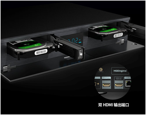 BDP-H650NEW配备双硬盘仓,双独立通道STAT3.0数据接口,支持30T以上超大容量硬盘存储,满足海量影音收藏需求,双HDMI端口,支持音画分离输出。