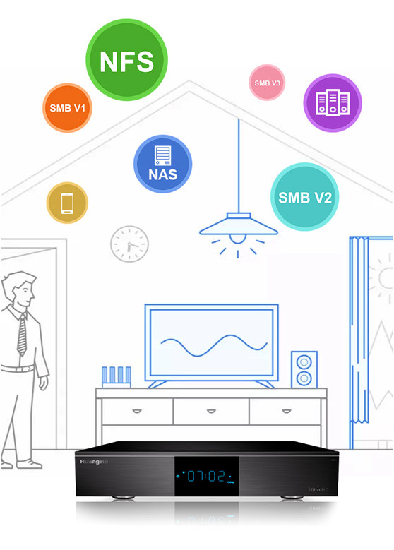 拥有千兆网络传输,可支持NFS/SMB1.0/2.0/3.0网络协议,对局域网内自动扫描所有可用的网络驱动器,并提供迅速稳定,安全可靠的网络媒体读取,支持NAS、电脑等服务器,同时,播放器本身也可以共享SMB服务,局域网共享本机硬盘存储的媒体文件。