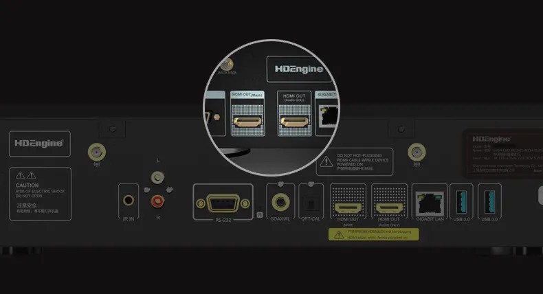 海缔力8K旗舰率先在8K芯片基础上开发了双HDMI输出音画分离技术。此技术由两颗定制芯片完成,应用数字分离技术,隔离干扰,主口配备HDMI2.1最高支持8K@60P输出。两颗超高精度音频专用晶振对副口HDMI音频输出进行时钟重构,精准的还原声音,大幅提升音质。并且副口支持多声道的DSD 64 Native输出。音画分离技术可以更好的兼容现有的AV前级与合并式功放,无需更换不支持8K的AV前级。