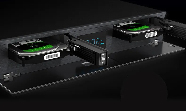 海缔力8K旗舰采用了前置隐藏式双硬盘仓设计,SATA3.0数据接口,支持30T以上超大容量硬盘存储,满足海量影音存储需求,方便且人性化。
