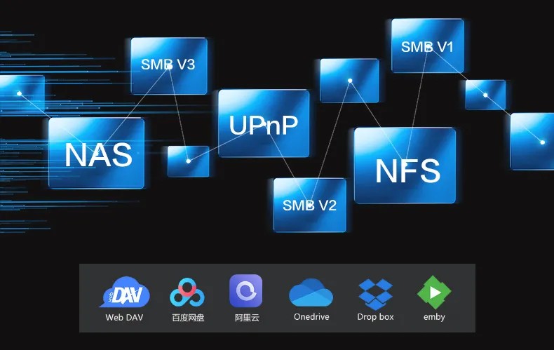 海缔力8K旗舰支持NFS、SMB v1/v2/v3.UPnP等局域网共享协议,通过本机可流畅访问并播放存储在局域网内NAS或者网络驱动器的多媒体文件。另外,还支持WebDAV、百度网盘等多种网盘的挂载和在线播放。