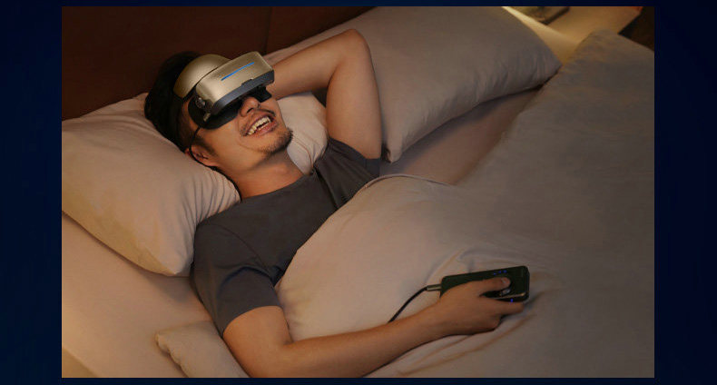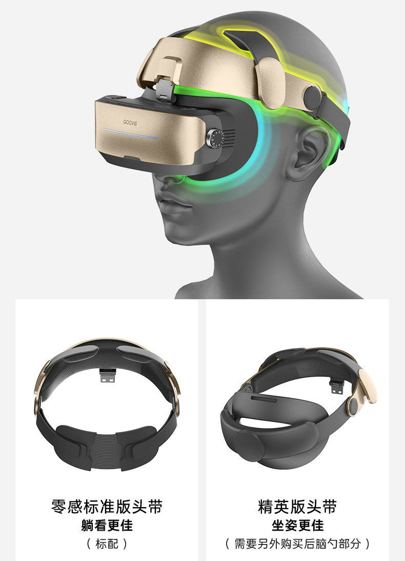 VISION MASTER 采用悬挂式佩戴设计, 将主要压力集中在额部,极大减轻面部压力,久戴不累。双头带配套,不同使用场景下快速替换,用软质头带半躺沙发,惬意享受。用精英头带,打游戏、办公稳稳当当,