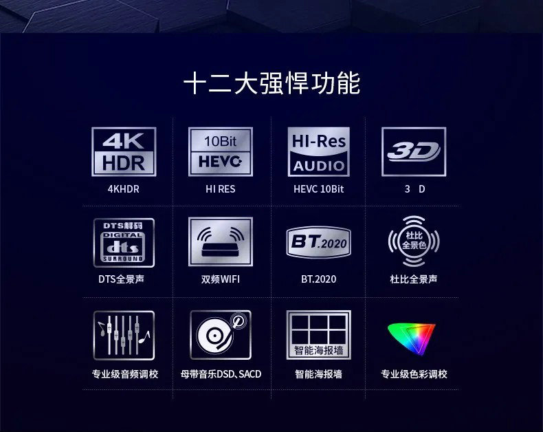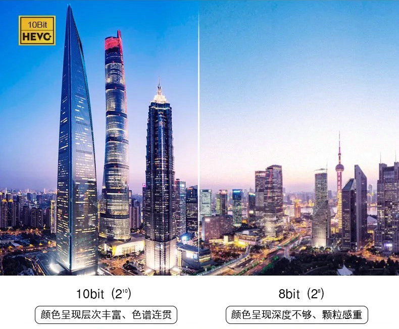 支持10bit色深显示,可显示10.7亿种颜色,比普通蓝光标准的8bit色深1677万种颜色,有64倍的表现能力;