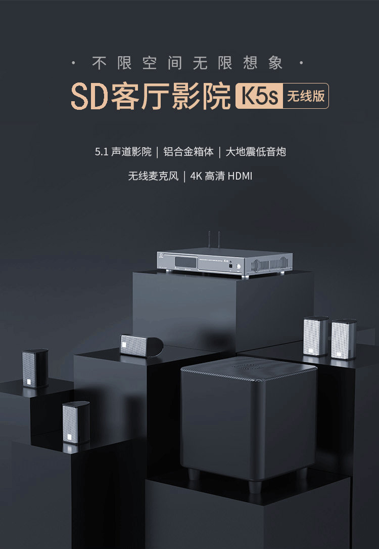 K5S设计有独立的5.1解码处理器可以轻松应对各种片源解码;内置UHF无线话筒接收器,亦可外挂话筒;内置5.8G无线后环绕接收器。精致小巧的铝合金外壳卫星箱