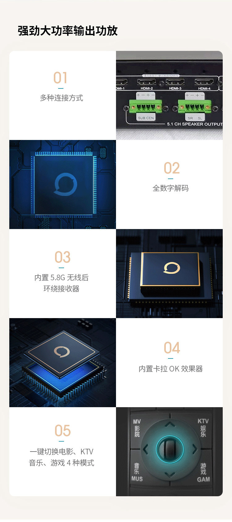 腔体采取涡轮式排列,对地增压,释放强大震撼感。功放主机具有视频四路高清4K HDMI输入和2路HDMI输出,其中包含ARC回传功能。数字COX、OPT输入、模拟AUX、5.0蓝牙播放功能。随机自带4种出场模式
